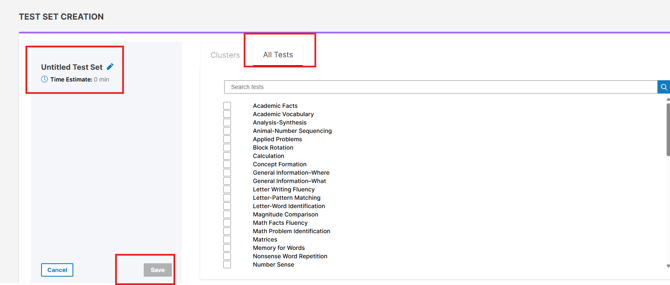 - Then you will need to hit the untitled Test Set and name it. Then once the subtests are checked and it is named the save button will turn blue. Then hit save and it will take you to your test sets dashboard. You can then assign it to any examinee.