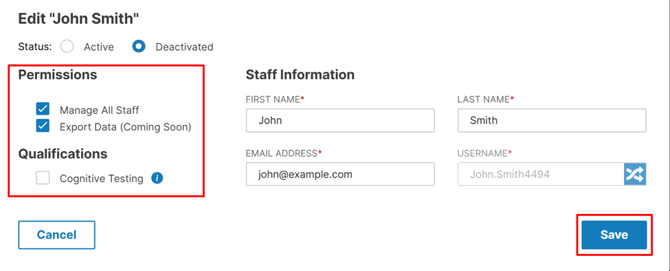 - Cognitive Testing Access – allows the staff member to administer cognitive tests.