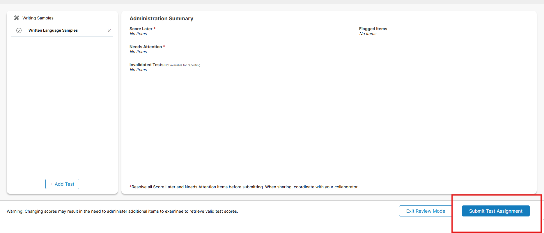 Once in review mode in the bottom right hand corner there will be a submit test assignment button. You will just need to click on submit and then it will submit and you can generate your report. If for some reason the button is not blue go into administration mode and see if you need to end the test then go to try again to submit.