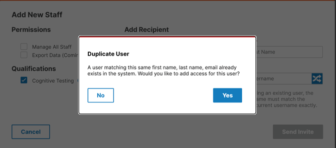 If a staff member already has an account on another Riverside Score platform (such as WJ IV or BDI-3), you can link their accounts so they use one single username across all systems. This happens automatically when you add them to WJ V using the exact same first name, last name, and email. When the information matches, the system will recognize the user and prompt you to link the accounts.